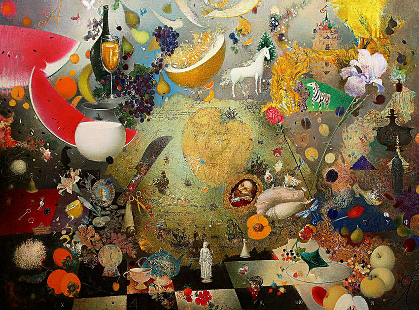 Фигуры мужчины и женщины буквально парят в воздухе, кажется, автор не обращает внимания на элементарные законы физики, ведь все в мире – относительно. Оттого канаты души перетягивают черный и белый голубь, а, падая в бездну, девушка хватается за зонт, как за спасение. Все условно, как и грань между реальным и фантастическим.