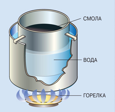Первым делом покупаем в спортивном магазине специальную лыжную смолу. Одного тюбика на пару лыж хватит. Из двух консервных банок делаем водяную баню (см. рисунок). На водяной бане разогреваем лыжную смолу. Далее берём обычный утюг, аккуратно прогреваем скользящую поверх-ность лыжи и смазываем её горячей смолой. Чтобы смола лучше впиталась, проглаживаем лыжу утюгом. Когда первый слой смолы подсохнет, накладываем второй, а затем и третий. Просмолённая поверхность должна иметь густой тёмно-коричневый цвет.