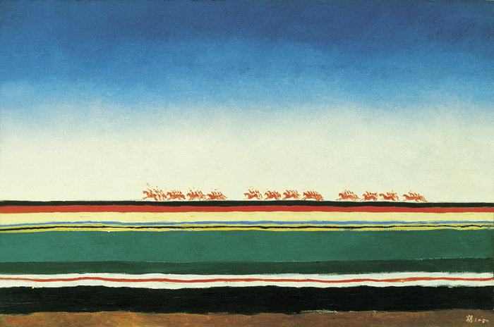 Изначально в этой  композиции всадников не было. Надпись "18 год" - мистификация художника, картина создана между 1928 и 1932 годами. На обратной стороне холста Малевич написал  "Скачет красная конница из октябрьской столицы на защиту советской границы". Это создатель философии беспредметности частушку сочинил, опа, как Демьян Бедный! Загадочное произведение.