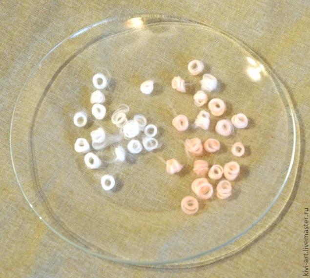 Затем я наметила,где примерно будут распологаться цветки и на эти места наклеила "тычинки" на порцелан-клей для запекания.Потом сверху приклеивала для каждого цветка по 5 лепестков,чередуя белые,розовые и бледно-желтые.