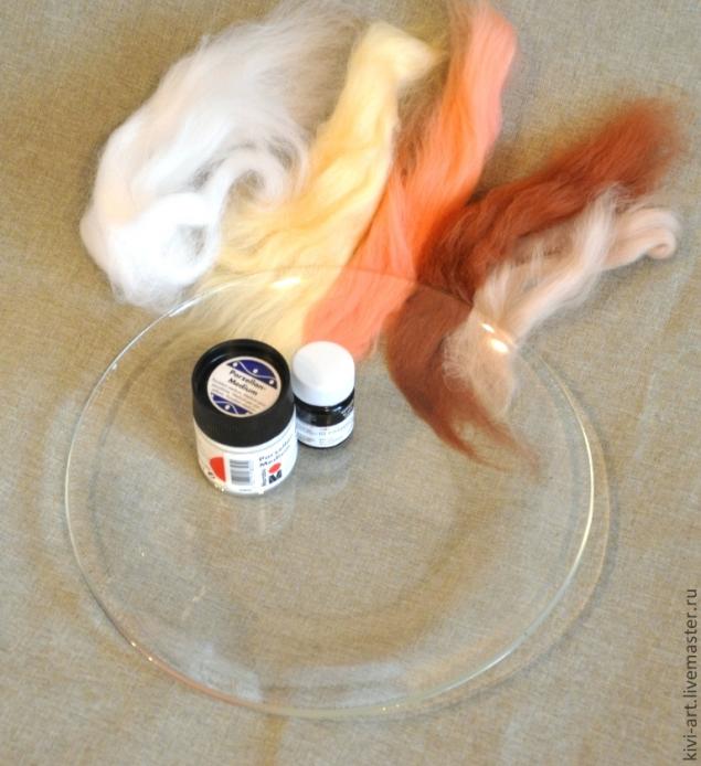 Вдохновили меня на эту работу картины.сделанные в технике "шерстяная акварель".Захотелось применить это как-то для утилитарных целей.Вот я и решила,что сделаю обратный декупаж шерстью. Запекаемыми материалами-не интересно мне делать вещи,которые будут без дела пылиться на полках...