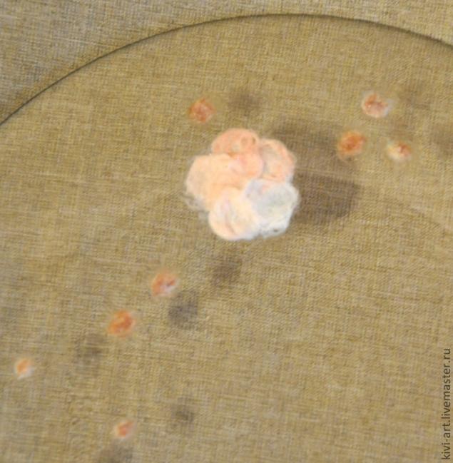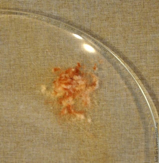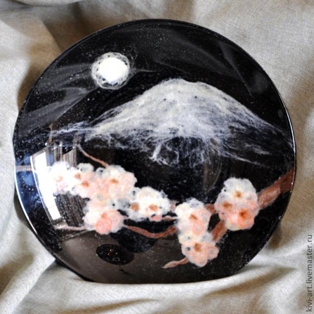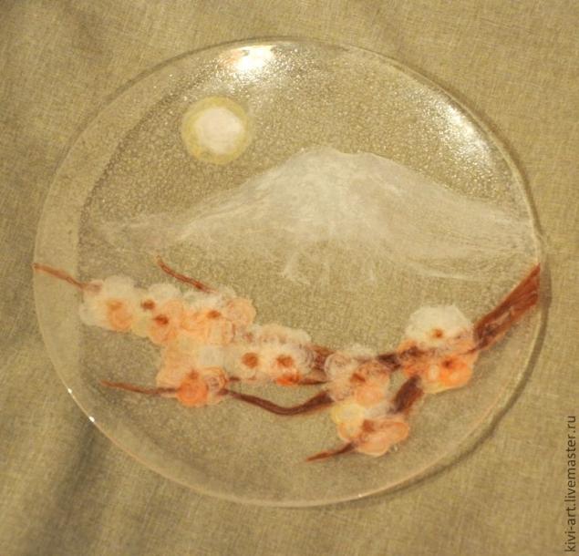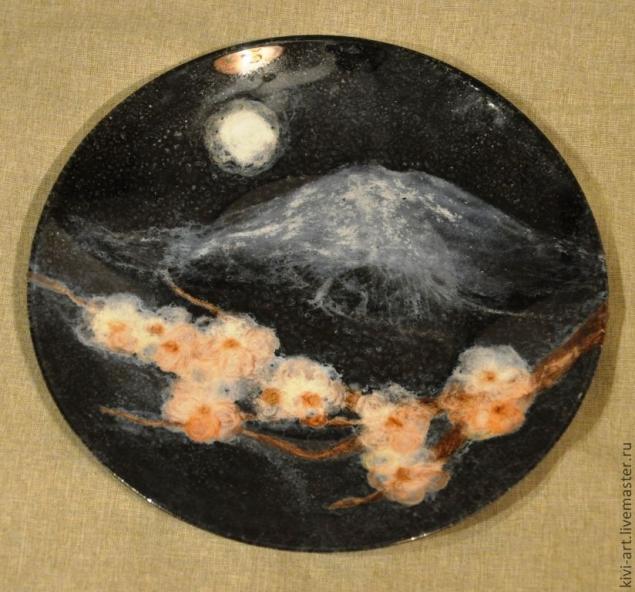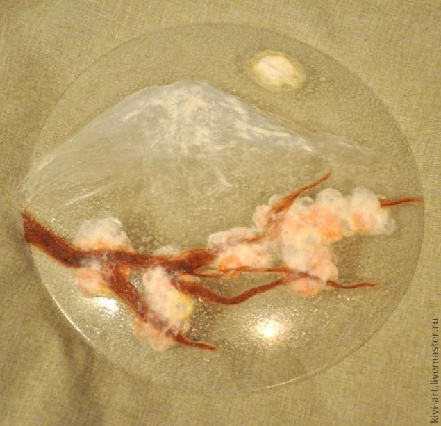 После того,как все цветы были на своих местах,я "нарисовала" ветку,Фудзияму и луну.Намучилась я ,конечно,изрядно)))-шерсть приклеивалась не только на тарелку,но и на руки,и на стол))).И кроме того,было очень трудно не запачкать клеем прозрачную часть тарелки.И,тут я решила воспользоваться главным принципом дизайна: "Если не можешь исправить недостаток-преврати его в достоинство!"И,не долго думая,я губкой нанесла порцелан на всю поверхность тарелки.)))