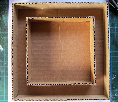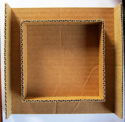 Для этого из плотного картона (очень подошёл бы пивной картон) вырезаем квадрат 18х18 см. с окошком 12х12 см. Промазываем клеем все торцы коробочки и приклеиваем наш квадрат.