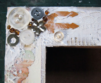 Наносим пасту не очень толстым слоем, чтобы сохранилась фактура всех наших кружавчиков и обрезков)) Кое-где можно положить пасты побольше и мастихином пошлёпывающими движениями создать фактуру.. хм.. декоративной штукатурки что ли)) В общем, на следующем фото видно))