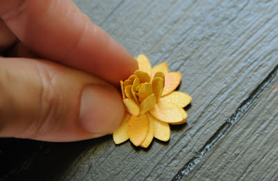 Mist your larger flowers slighting with water and scrunch your petals to distress them a bit. I accordion pinch the petals slightly. Let them dry completely.