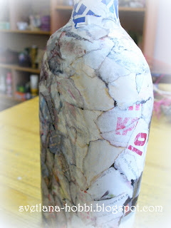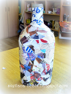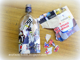 Приступаем. Берем пару страничек из глянцевого(обязательно) журнала, рвем на произвольные кусочки и обклеиваем ими бутылку.