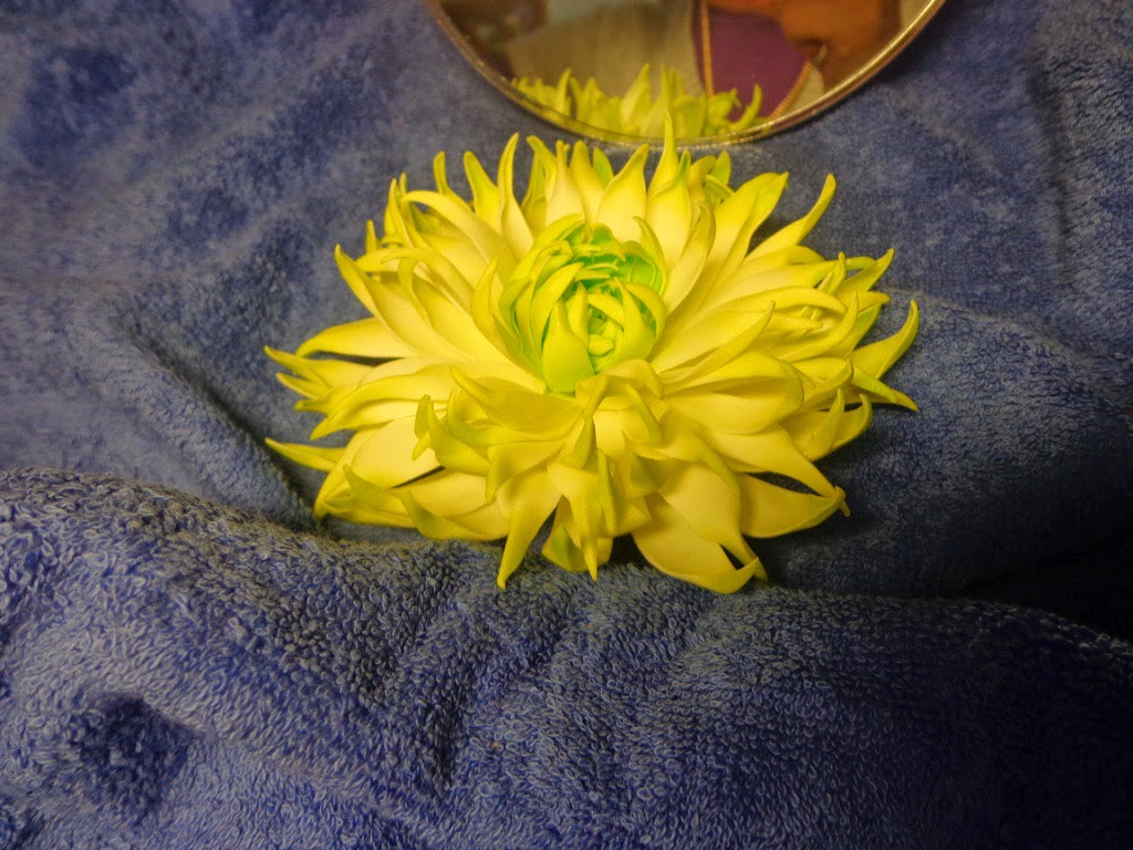 Уже после полной сборки цветка я слегка затонировала края больших лепестков ярко-желтой пастелью.