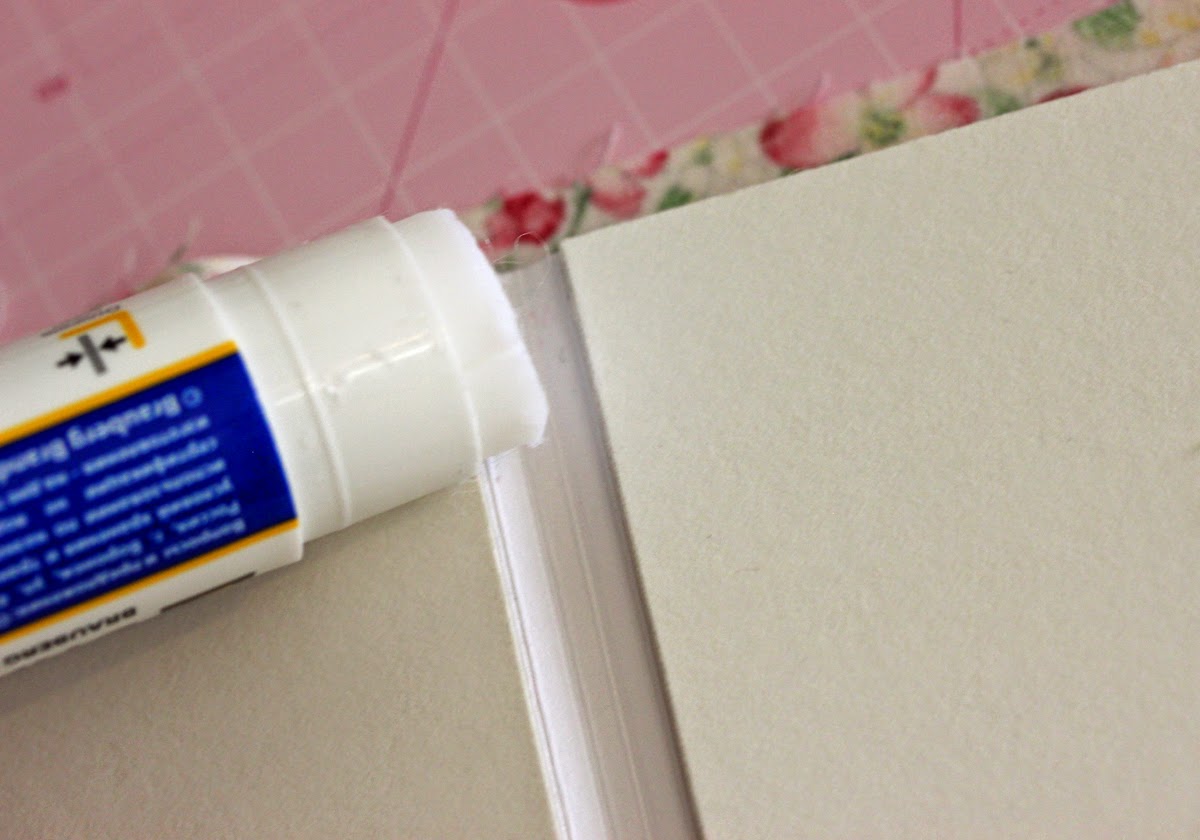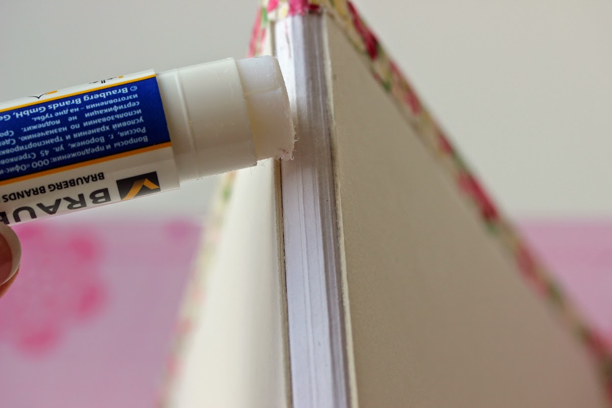 ю с верхней (длинной) стороны. Клеем-карандашом промазываем край картона по всей длине обложки на ширину тех самых 1,5 - 2 см, особое внимание уделяем корешку (ложбинке между частями обложки), излишки клея (кусочки) обязательно нужно удалять салфеткой: