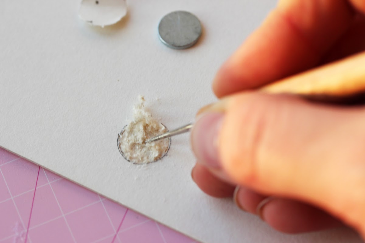Любым удобным подручным инструментом (тем же ножом, инструментом для биговки, шилом, спицей и т.п.) аккуратно выскабливаем внутренние слои картона для того, чтобы в образовавшееся "гнездышко" поместился наш магнитик:
