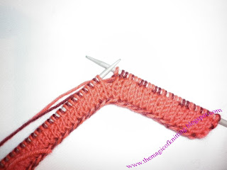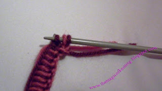 Замечание: Иногда в описаниях встречается немного другой метод, в котором каждая 2-я петля (изнаночные) просто снимаются. Но мне это кажется нерациональным - за раз провязывается только одна сторона, тогда как я описала способ, когда за один ряд провязываются обе стороны вязания.