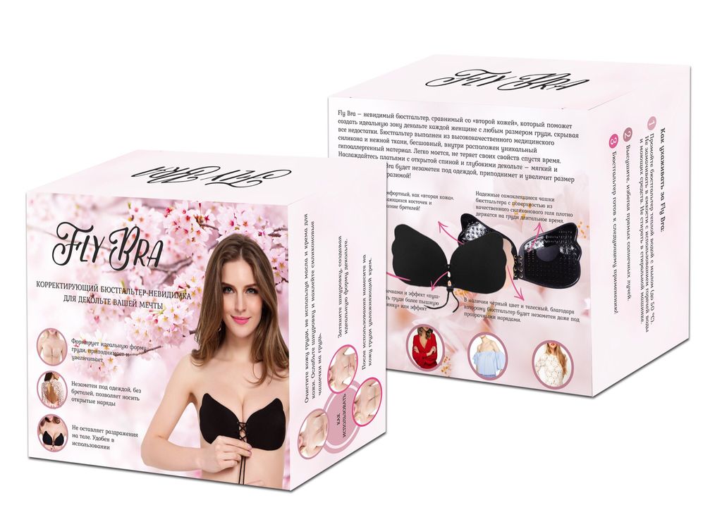 Бюстгальтер-невидимка – оригинальное изобретение для удобства и комфорта, он остается совершенно незаметным для глаз, выполняя все функции обыкновенного лифчика. Но Fly Bra – это лифчик-невидимка, он состоит из двух силиконовых чашечек, связанных между собой надежной шнуровкой. На заднюю сторону чашечек нанесена клеящаяся субстанция, с помощью которой белье удерживается на месте и не слазит. Это значит, что вы сможете чувствовать себя комфортно, сочетая бюстгальтер с вечерним нарядом, ведь вам не придется волноваться о том, что лямка может соскочить!
