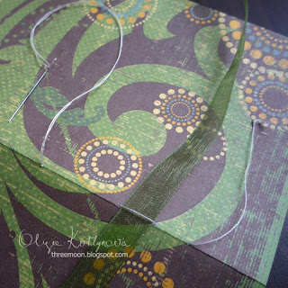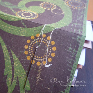 Последней с блоком сшиваем обложку. Хвостики нитки уводим внутрь