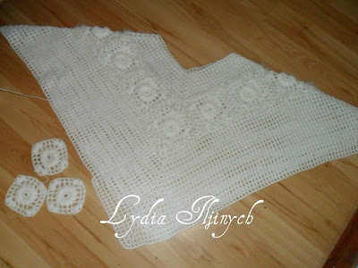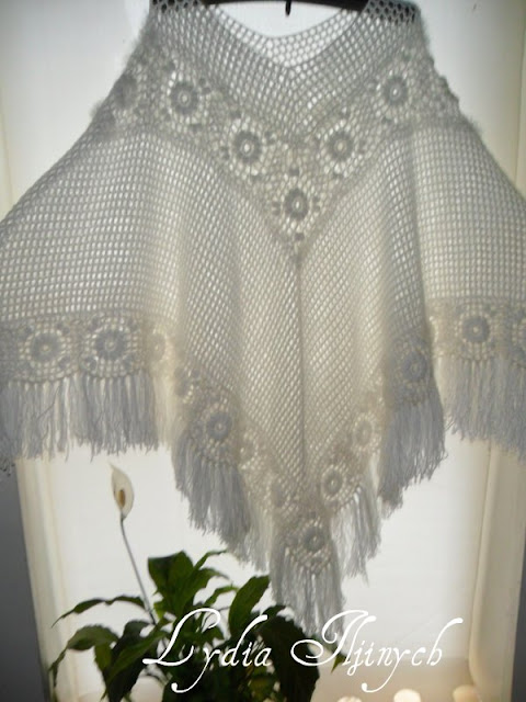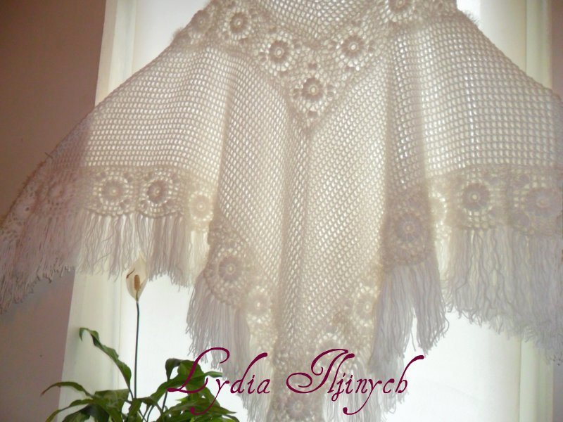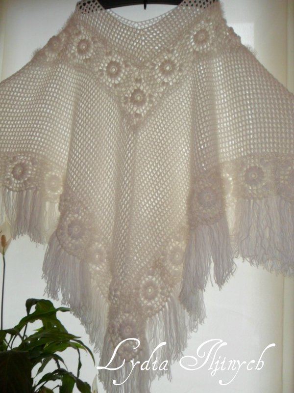 Это пончо я связала крючком на заказ.Начало вязания сверху. Набираем цепочку сколько нужно (по усмотрению),делим на четыре равных части,отмечаем цветной ниткой границы углов будущего пончо и вяжем филейной сеткой до первой вставки из квадратных мотивов (мотивы можете взять какие хотите,по вкусу.).