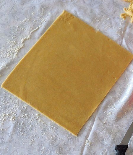 3. Достаньте охлажденное тесто, посыпьте мукой рабочую поверхность и раскатайте тесто в прямоугольники толщиной 2–3 мм. Обрежьте неровные края ножом.