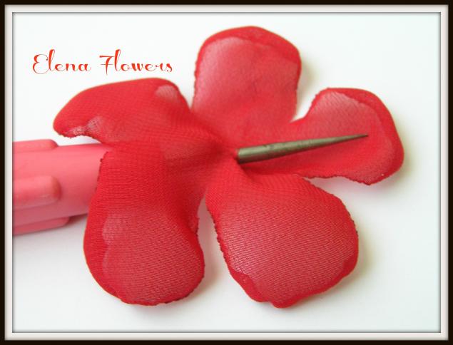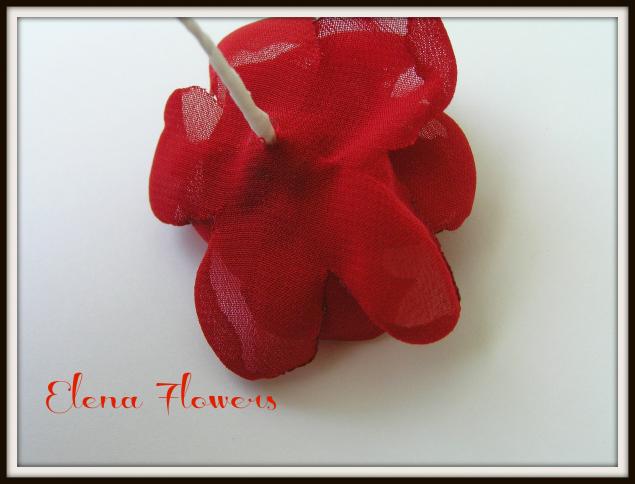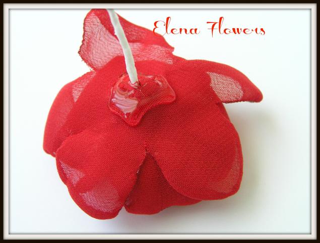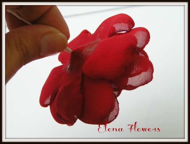 Прилажеваем лепесток к серцевинке и пришеваем по срединке,делаем два небольших стежка.