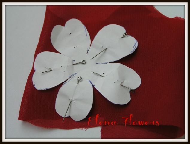 Складываем шифон и прикладываем к нему выкройки,прикалывая их иглами.