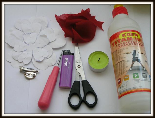свеча,зажигалка,шило,клей,металлическая фурнитура(у меня брошь-заколка).