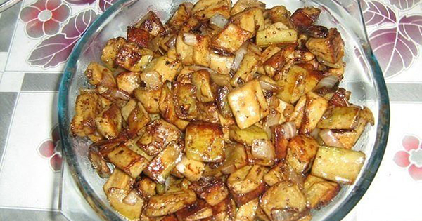 3–4 средних баклажана; 2 средних луковицы; 3 яйца; горсть сушеных грибов; растительное масло для жарки; черный молотый перец.Срежь с баклажанов кожицу и нарежь их кубиками. Взбей яйца в пену и залей ими баклажаны. Тщательно перемешай и накрой крышкой. В течение часа еще 5–6 раз перемешай баклажаны. В результате яиц не должны быть видно совсем. Выложи баклажаны на сковородку и слегка обжарь их на растительном масле. Нарежь лук кубиками и добавь его на сковороду. Перемешай и продолжай жарить минуты три. Высыпи измельченные сушеные грибы на сковороду и доведи блюдо до готовности. Приправь перцем. Это блюдо будет очень вкусным как в горячем, так и в холодном виде.