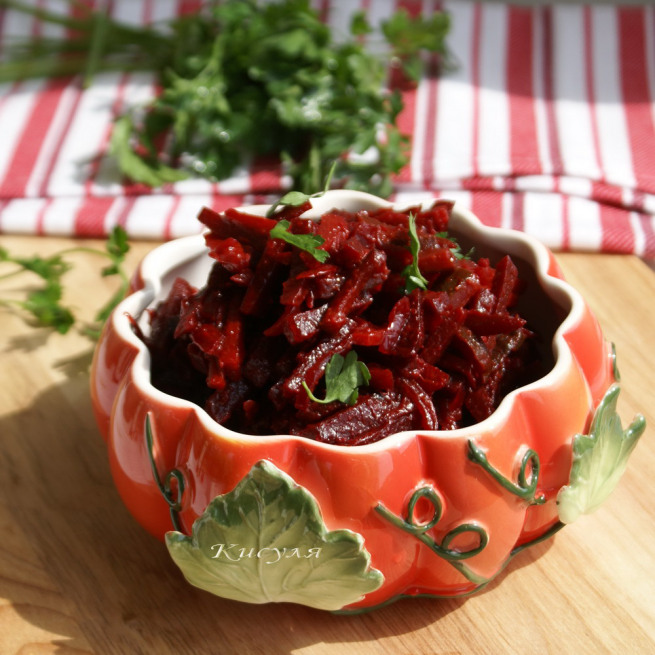 Свёклу очистить, нарезать соломкой. Так же, соломкой, нарезать морковь и солёные огурцы, лук нарезать перьями. Свёклу припустить в небольшом количестве жидкости и оливкового масла, отложить в отдельную посуду. Лук с морковью пассеровать. Добавить томатную пасту, продолжить обжаривать 5-6 мин. Затем, добавить припущенную свёклу и солёные огурцы. Тушить до готовности, добавить сахар, соль, перец и измельченный чеснок. Подавать блюдо горячим.