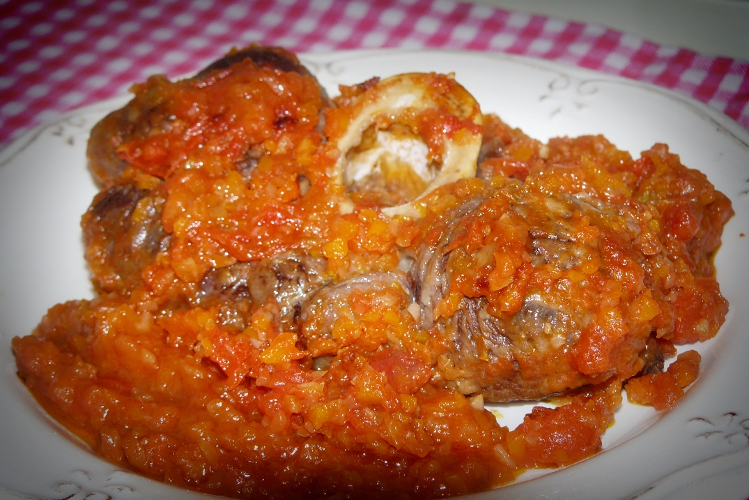 Мясо панируем в муке и обжариваем с обеих сторон в 2 ст.л. оливкового масла до образования легкой корочки. Перекладываем на глубокий противень. Измельчаем лук, морковь и чеснок. Обжариваем их в оставшемся оливковом масле в течение 3-4 минут, постоянно помешивая. К овощам добавляем бульон, вино, томаты, сахар и перемешиваем. Доводим соус до кипения и держим на огне еще 5 минут. Выливаем готовый соус на мясо. Накрываем мясо фольгой и ставим в предварительно разогретую до 180 градусов духовку на 1 час 45 минут. Чаще всего подают, посыпав гремолатой – смесью из лимонной цедры, измельченных петрушки и чеснока. В качестве гарнира итальянцы предпочитают ризотто по-милански или просто рис.