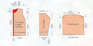 Задняя часть: переведите петли задних левой и правой штанин на одну спицу = 64 п. и вяжите лицевой гладью 6 см. Далее закройте с обеих сторон 1 раз х 1 п. и в следующем 18-м ряду еще 1 раз х 1 п. На общей высоте 34,5 см закройте для пройм с обеих сторон 1 раз х 3 п. и далее в каждом 2-м ряду 1 раз х 2 п. и 1 раз х 1 п. На высоте 43,5 см закройте для горловины средние 8 п. и далее обе стороны вяжите отдельно. Для закругления выреза закройте с внутренней стороны во 2-м ряду 1 раз х 4 п. На высоте 45 см закройте петли правого плеча, а на левом - вяжите еще 2 см платочной вязкой. При этом на планке выполните 2 отверстия для пуговиц (2 п. вместе, накид).