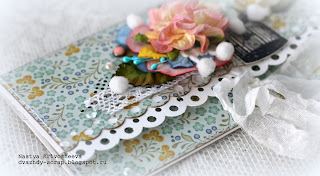 Затем приклеиваем скрапбумагу. Я наношу клей на середину бумаги и аккуратно по "бардюрному" краю. А по периметру делаю машинную строчку.