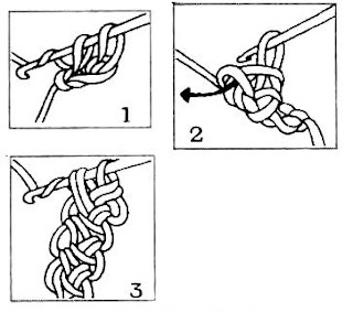 Например, нужно перебросить влево одну петлю через две соседние. Для этого провязывают три петли, затем, направив левый конец спицы в третью из них (начиная слева направо), оттягивают ее на себя и перебрасывают влево через вторую и первую лицевые петли. На лицевой стороне узора видна часть нити, стягивающая две петли, расположенные внутри.