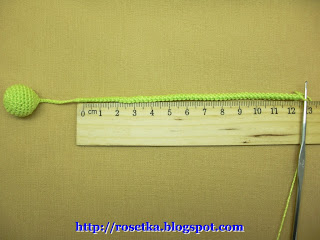 Изготовить маленькие помпоны. На чулочные спицы набрать 6 п. и вязать лиц. гладью. Во 2-м ряду все петли удвоить, провязать 1 ряд, затем удвоить каждую 2-ю п. Связать 2 круг. ряда, после чего закончить симметрично. Помпоны набить остатками пряжи, стянуть сверху и привязать цепочку из возд. п. для крепления. Для каждой узкой стороны изготовить 10-12 помпонов и прикрепить их цепочками из возд. п. на разной длине.
