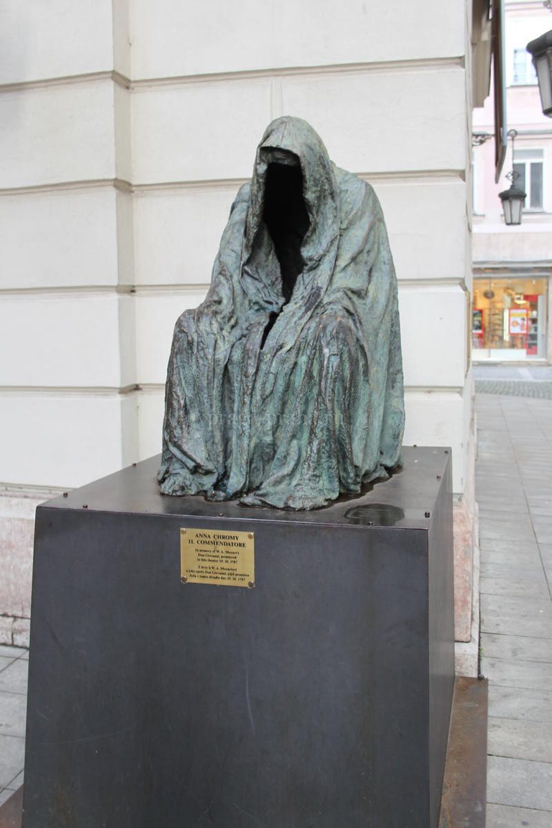 У входа в старинный пражский Сословный театр гостей поджидает необычный привратник. На пьедестале восседает закутанная в плащ фигура. Но это вовсе не трюки уличных артистов! Если приглядеться, то мурашки поползут по спине - под бронзовыми складками плаща никого нет...