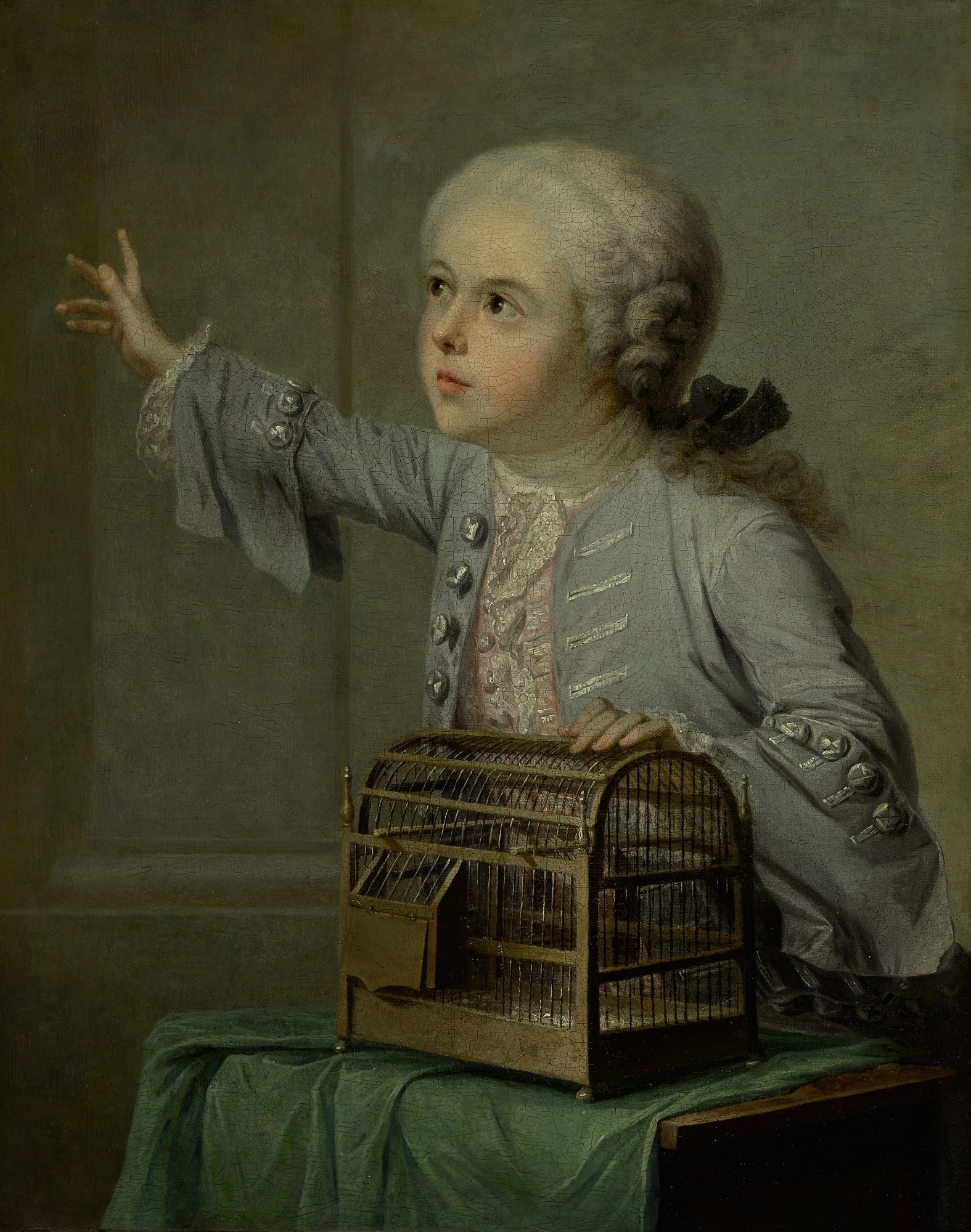 A BOY SEATED AT A TABLE, LOOKING UP, WITH AN OPEN BIRDCAGE