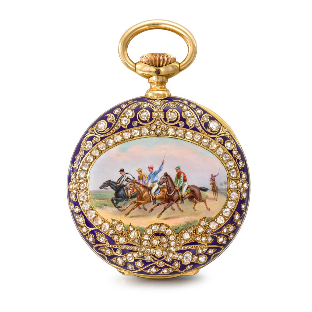WEST END WATCH CO. | A GOLD, ENAMEL AND DIAMOND-SET HALF-HUNTING CASED MINUTE REPEATING CLOCK WATCH MADE FOR THE INDIAN MARKET | CIRCA 1910