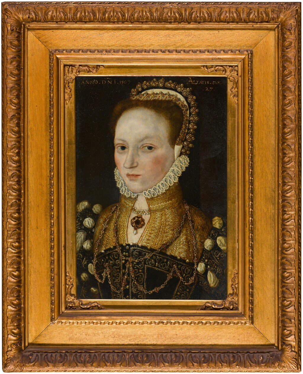Portrait of a lady, bust-length, wearing an elaborate jewelled headpiece, and embroidered dress and chemise