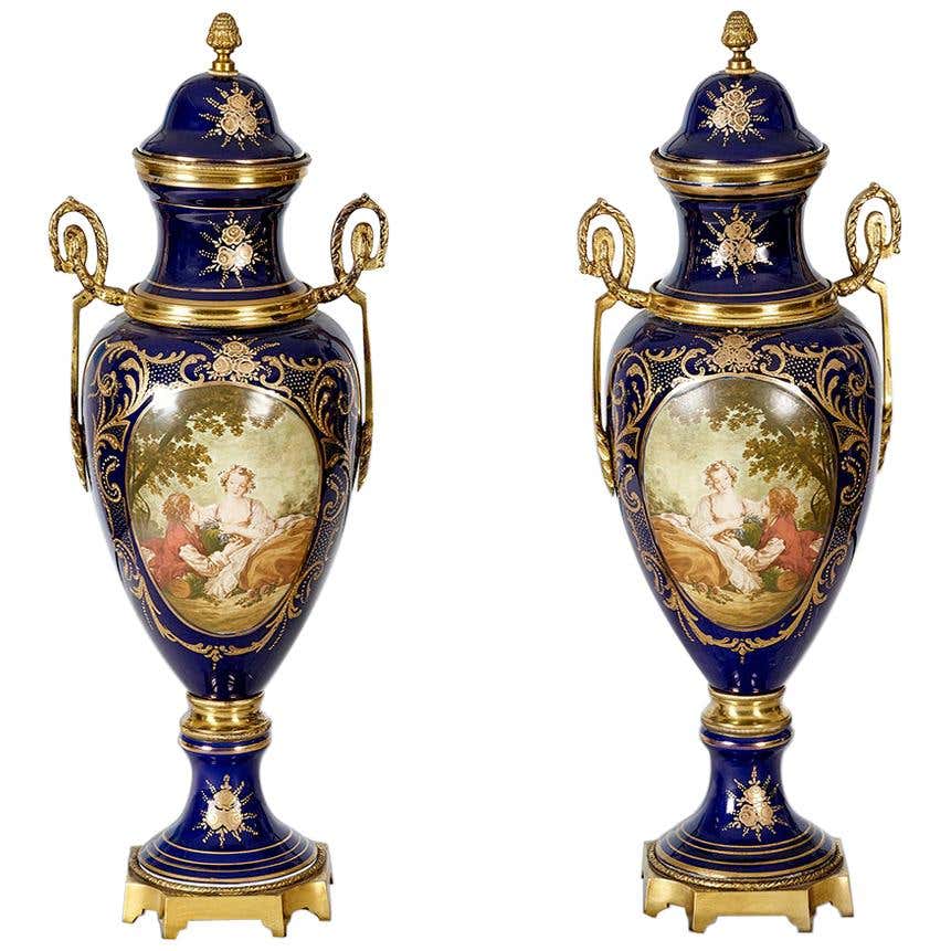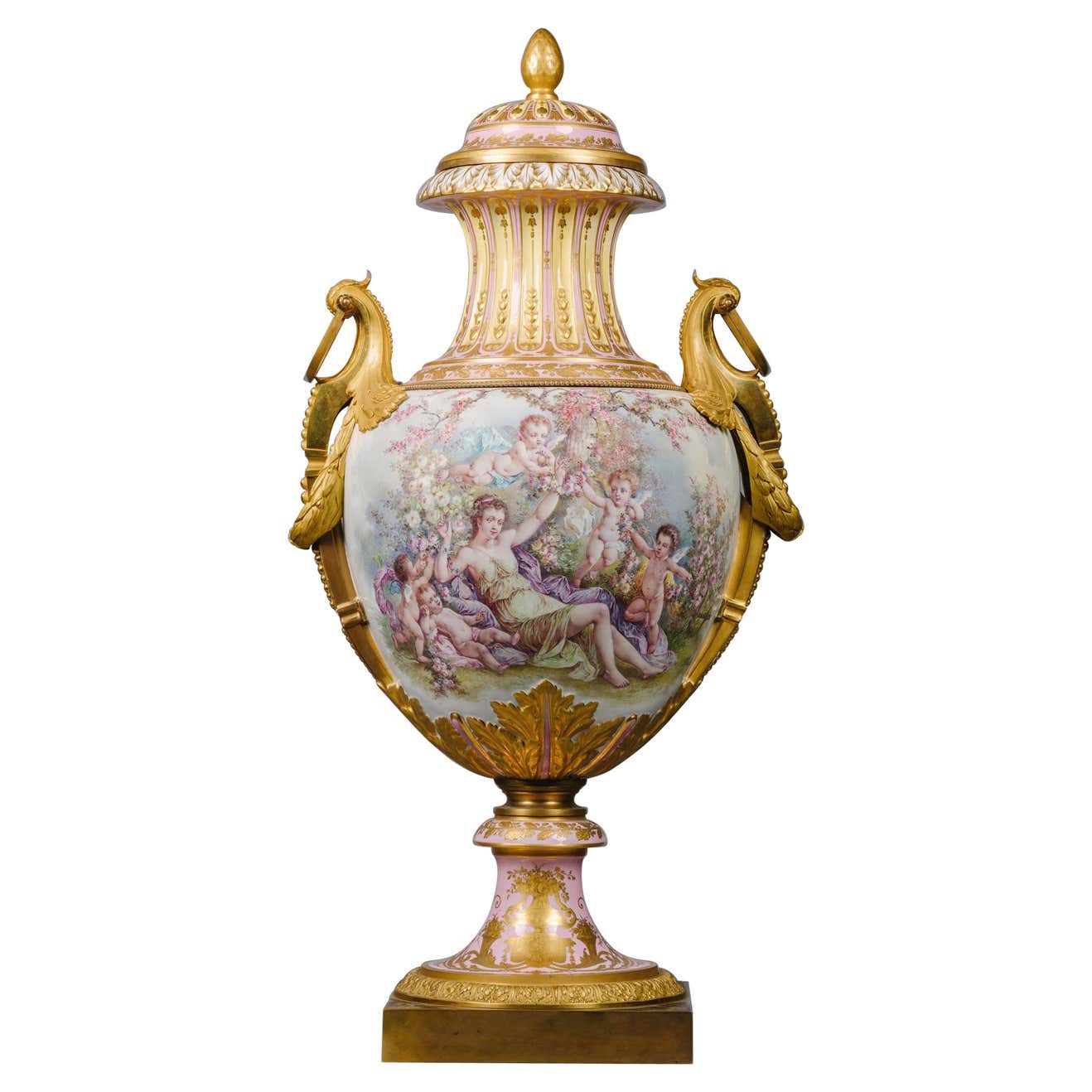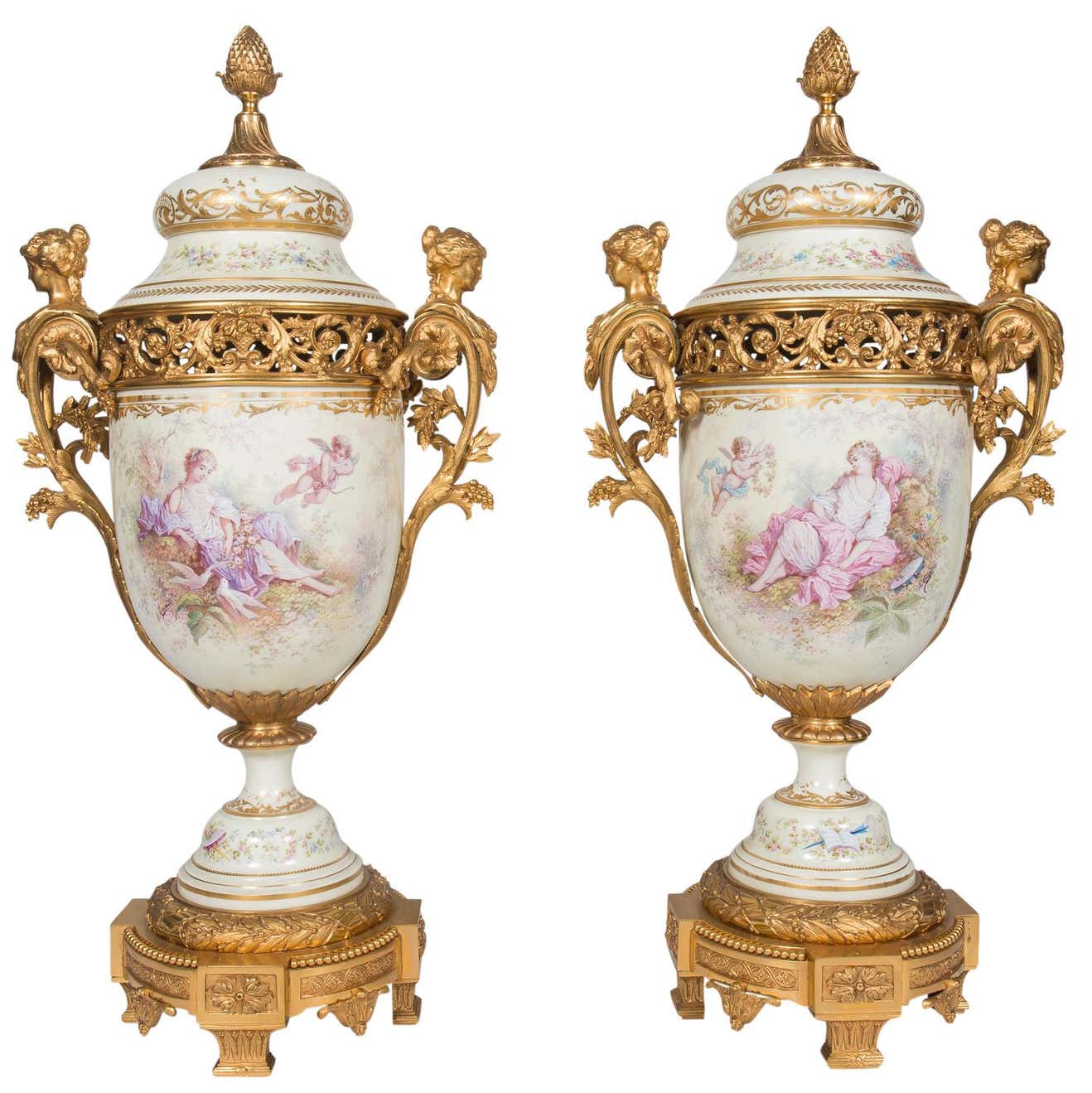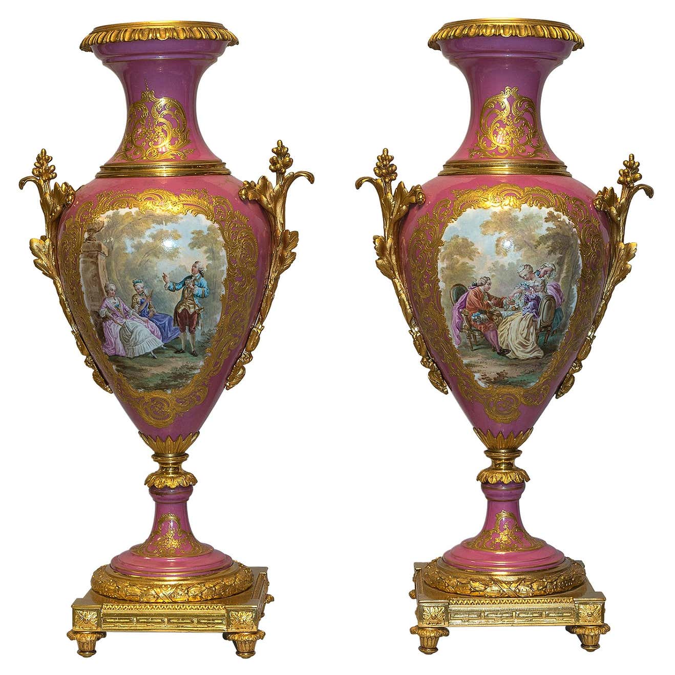 Pair of Large Antiques French Ormolu-Mounted & Painted Pair of Sèvres Porcelain