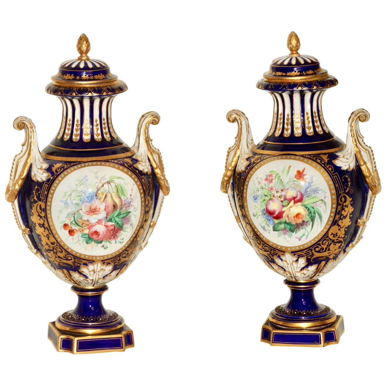 A pair of Minton cobalt-blue ground "New Dresden" pot-pourri vases and covers, ca. 1838. Sold at Christie's, New York, Apr 20, 2005.