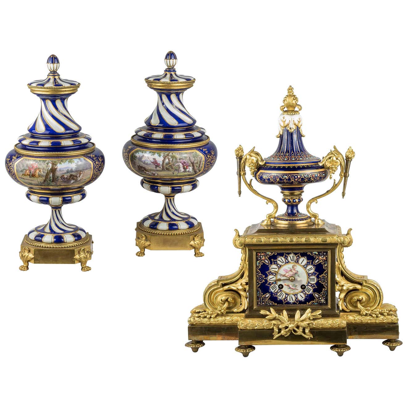 Antique Rococo Style Porcelain and Gilt Bronze Clock Garniture