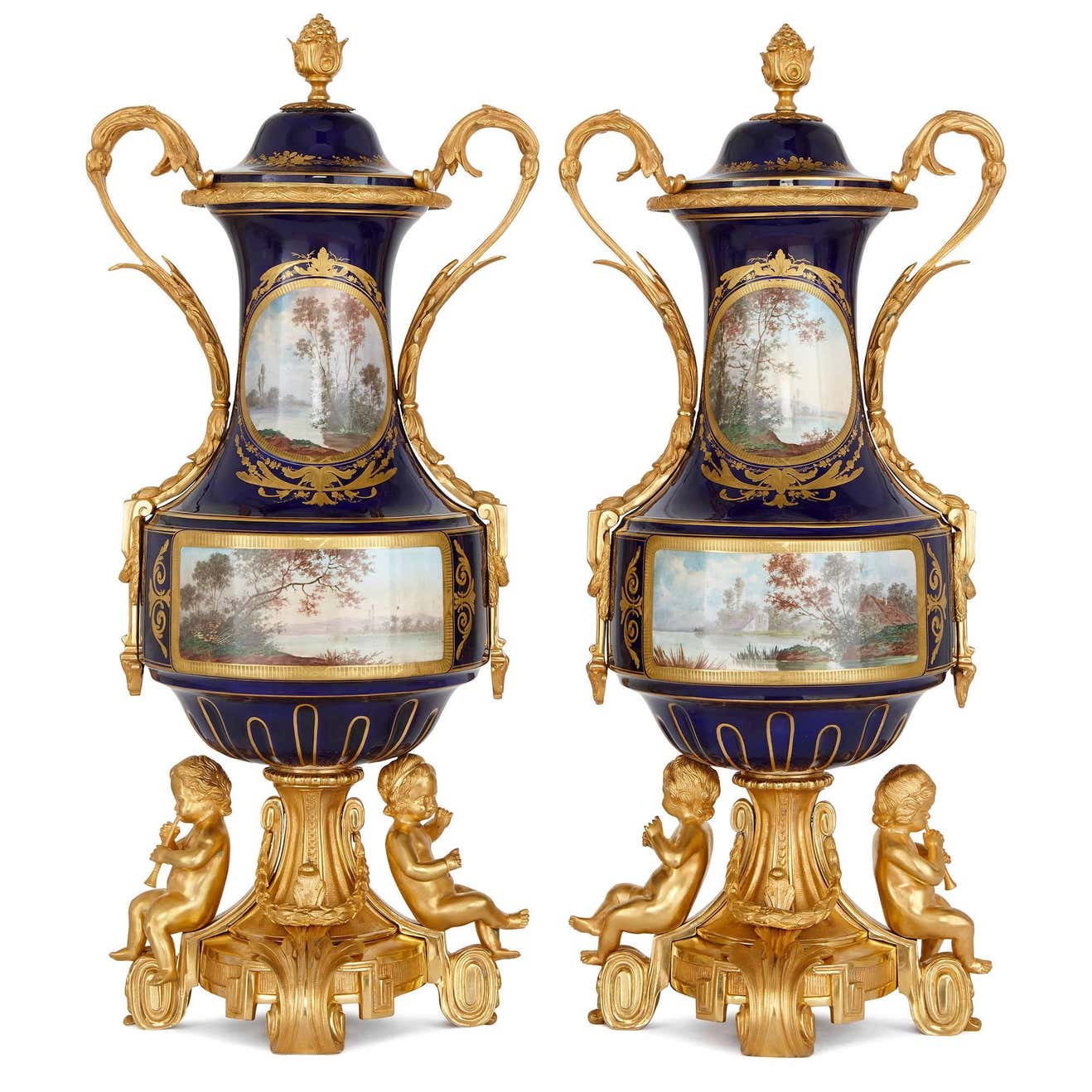 PAIR OF SÈVRES STYLE PORCELAIN URNS AND COVERS WITH GILT BRONZE MOUNTS PAINTED WITH CHERUBIC SCENES BY CHARLES FUCHS France, circa 1895