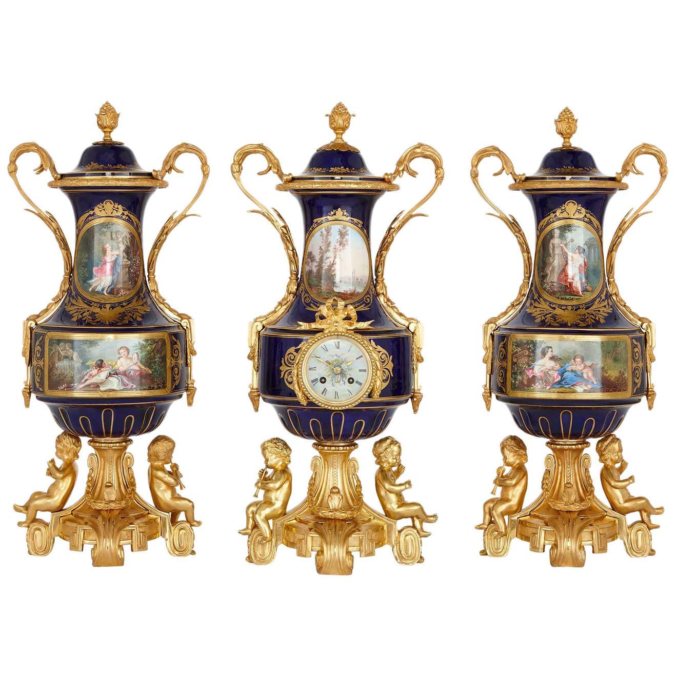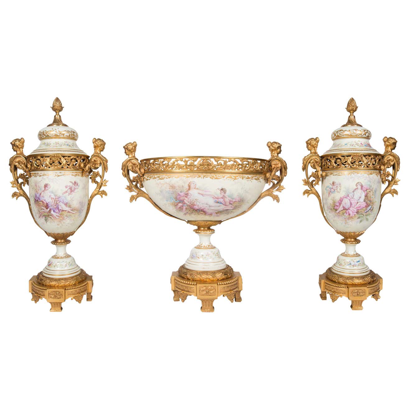 Sèvres Style Porcelain and Gilt Bronze Jardiniere and Vase Garniture