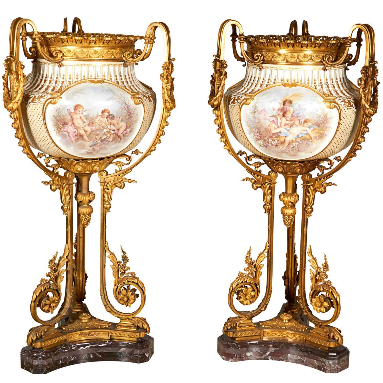 Important and Palatial Pair of Ormolu and Sèvres Style Porcelain Jardinieres