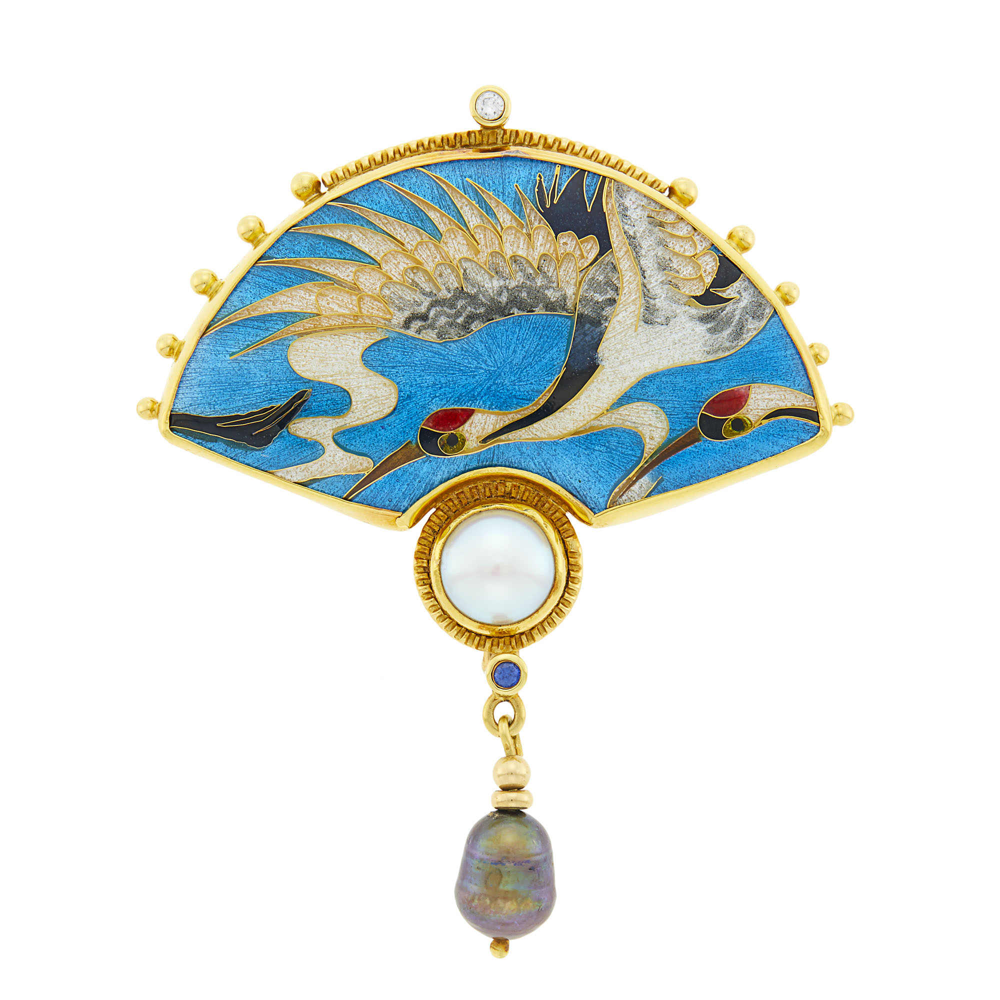 Tricia Young Gold, High Karat Gold, Cloisonné Enamel, Mabé Pearl, Diamond and Brown Baroque Cultured Pearl Fan Brooch/Enhancer