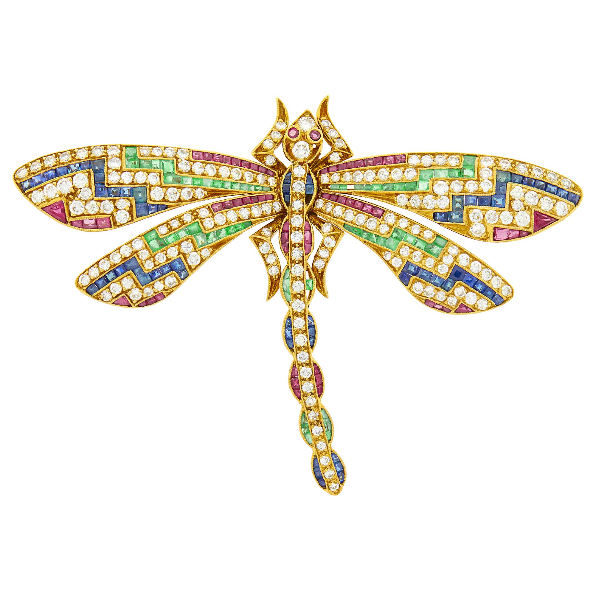 Gold, Diamond and Colored Stone Dragonfly Brooch