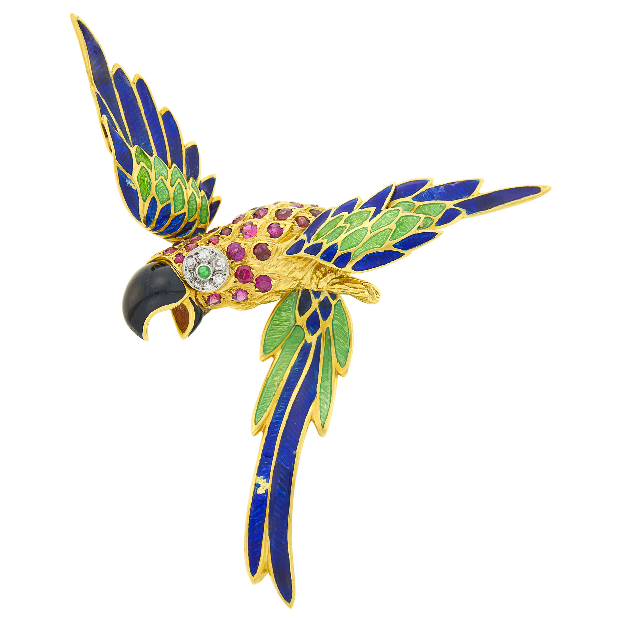 Gold, Enamel, Ruby, Diamond and Emerald Bird Clip-Brooch