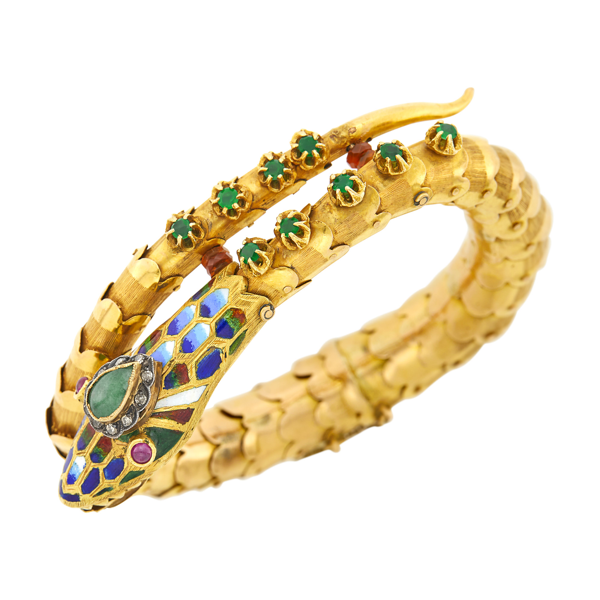 Gold, Gem-Set, Diamond and Enamel Serpent Bangle Bracelet