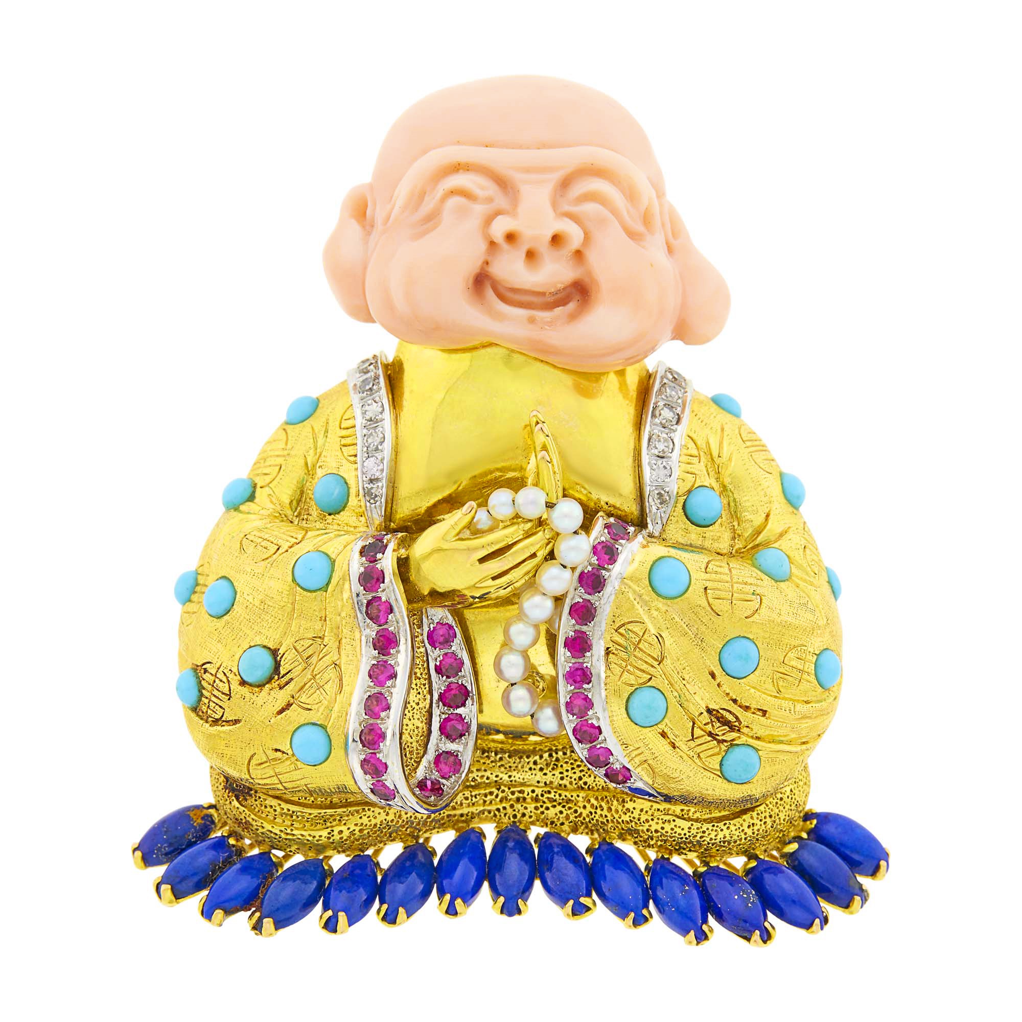 Gold, Carved Angel Skin Coral, Turquoise, Lapis, Ruby, Cultured Pearl and Diamond Buddha Clip-Brooch