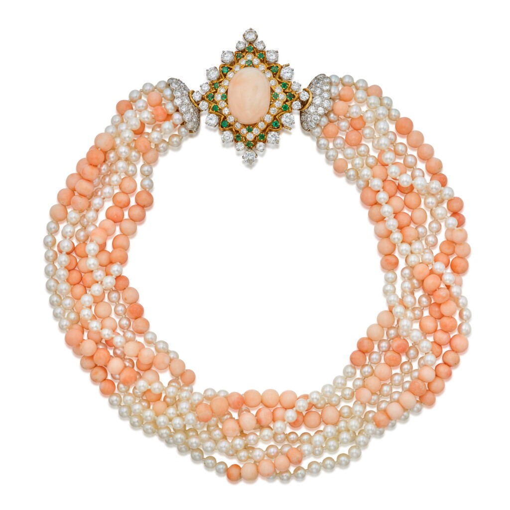 Coral, Cultured Pearl, Emerald and Diamond Necklace