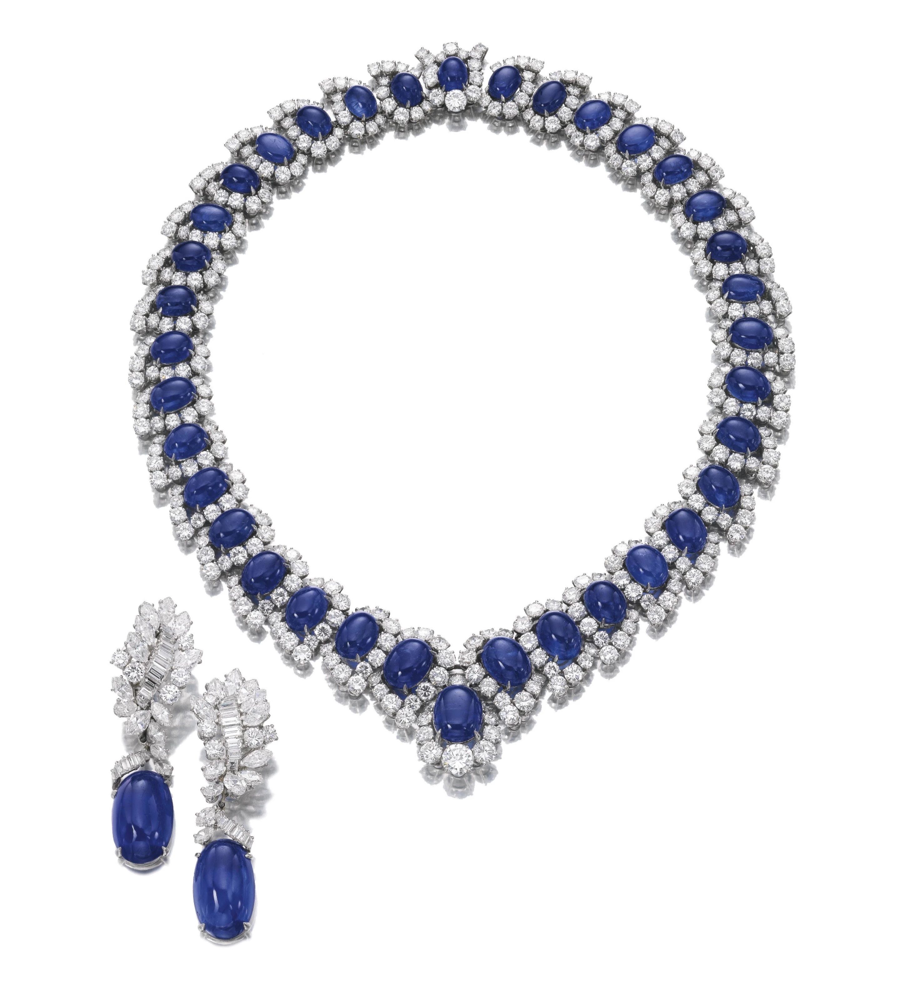 Important sapphire and diamond necklace and a pair of sapphire and diamond ear clips, Bulgari, circa 1965