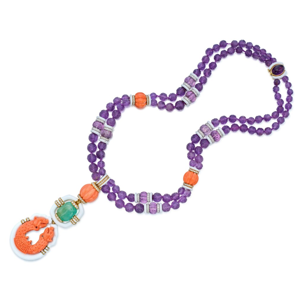 Amethyst, Coral, Emerald, Enamel and Diamond Sautoir