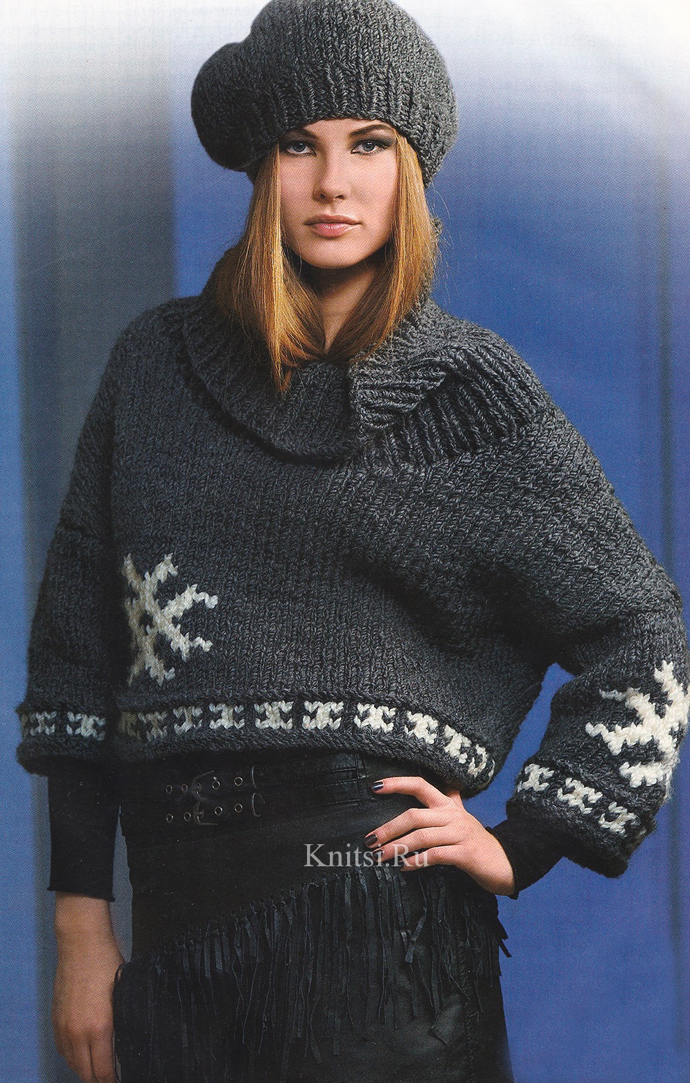 Чтобы связать рукава, нужно набрать на спицы с номером 2,5 32 петли и провязывать резинкой 4 см. Затем перейти на спицы номер 3,5 и провязывать узор по схеме 1, причем в 1 ряду нужно прибавить 12 петель, а в каждом 6 ряду – с двух сторон добавить 6 раз по 1 петле. Когда будет связано всего 19 см, петли нужно закрыть и закончить вязание.