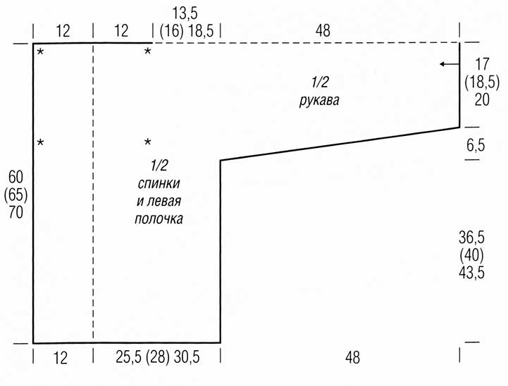 Описание работы: начать с левого рукава. Связать цепочку из 20 (22) 24 возд. п. + 2 возд. п. подъёма и вязать основным узором. Для скосов рукава прибавить с обеих сторон в каждом 4-м р. 4 х 1 п. = 28 (30) 32 п. Через 48 см = 18 р. от наборного края прибавить петли для боковых краёв полочки и спинки. Для этого в конце 18-го р. связать цепочку из 22 (24) 26 возд, п., повернуть и для 19-го р. обвязать её и 28 (30) 32 п. рукава основным узором. Затем петлю оставить и отдельной нитью присоединиться к последней п. 18-го р. Связать цепочку из 22 (24) 26 возд. п. и нить обрезать. Затем ввести крючок в оставленную п. и обвязать эту цепочку рабочей нитью основным узором = 72 (78) 84 п.