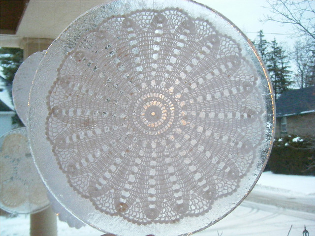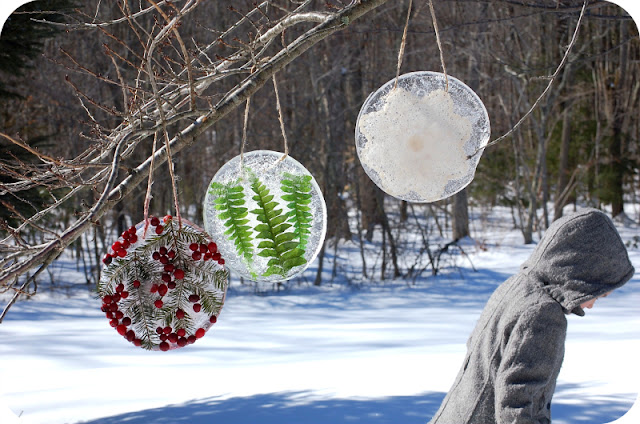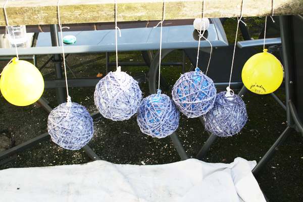 В шары налить воды, подкрашенную пищевыми красителями. Затем остудить на улице, снять с формы шарик (снимается легко, т.к. он не примерзнет) и разложить во дворе!