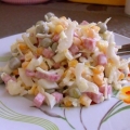 Капусту нашинковать, присыпать щепоткой соли, хорошенько обмять. Добавить горошек, кукурузу, нарезанные кубиками яйца и колбасу. Заправить майонезом.